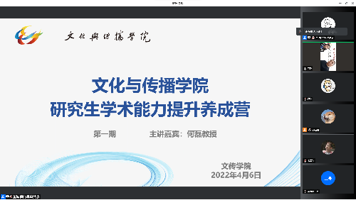 4月6日下午,哔咔漫画 在线上举办首期“研究生学术能力提升养成营”。院长石刚出席活动并讲话,希望研究生积极参加学习,明确研究兴趣,掌握研究方法,提高研究能力。本次活动由副院长郭媛媛主持。