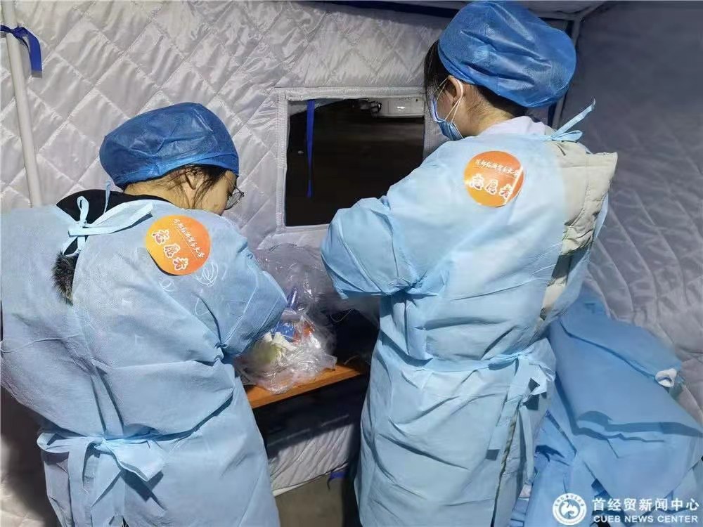 文传志愿者在检测现场帮忙联系居民、登记并核查预约码、协调检测现场的秩序、引导居民进行检测……他们一丝不苟,聚精会神地工作,耐心地解答居民们提出的每一个问题,坚守岗位,不畏艰辛,贡献出自己的青春力量!两天,1000小时,5位文传志愿者与九十余名首经贸志愿者一起配合西城区顺利完成广安门外、牛街两个街道的全员核酸检测工作!
