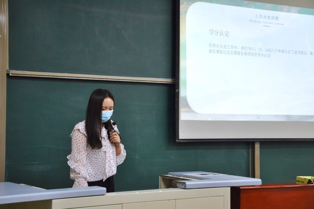 大会第一项,各部门按照组织部、志愿者团、社会实践部、行政中心、涉外部、文艺部、体育部、篮球队、足球队、生活学术部、辩论队、新媒体中心的顺序,分别进行了工作汇报。各位部长对本学期的部门工作进行回顾、总结,并且对下一学期的工作提出展望。