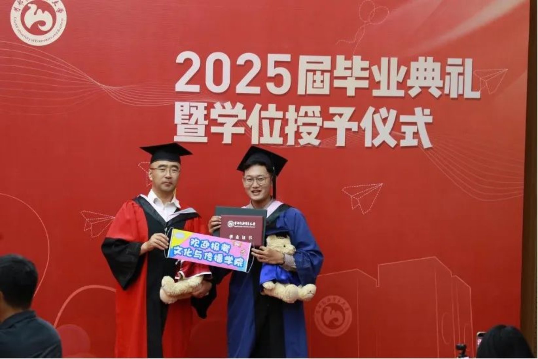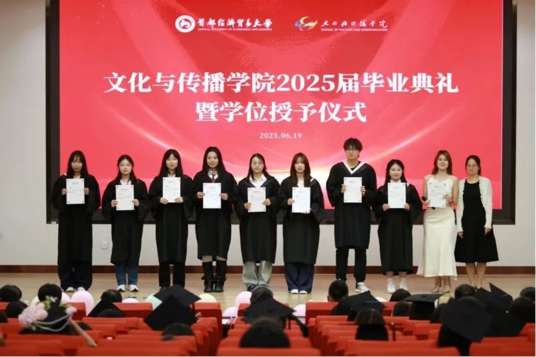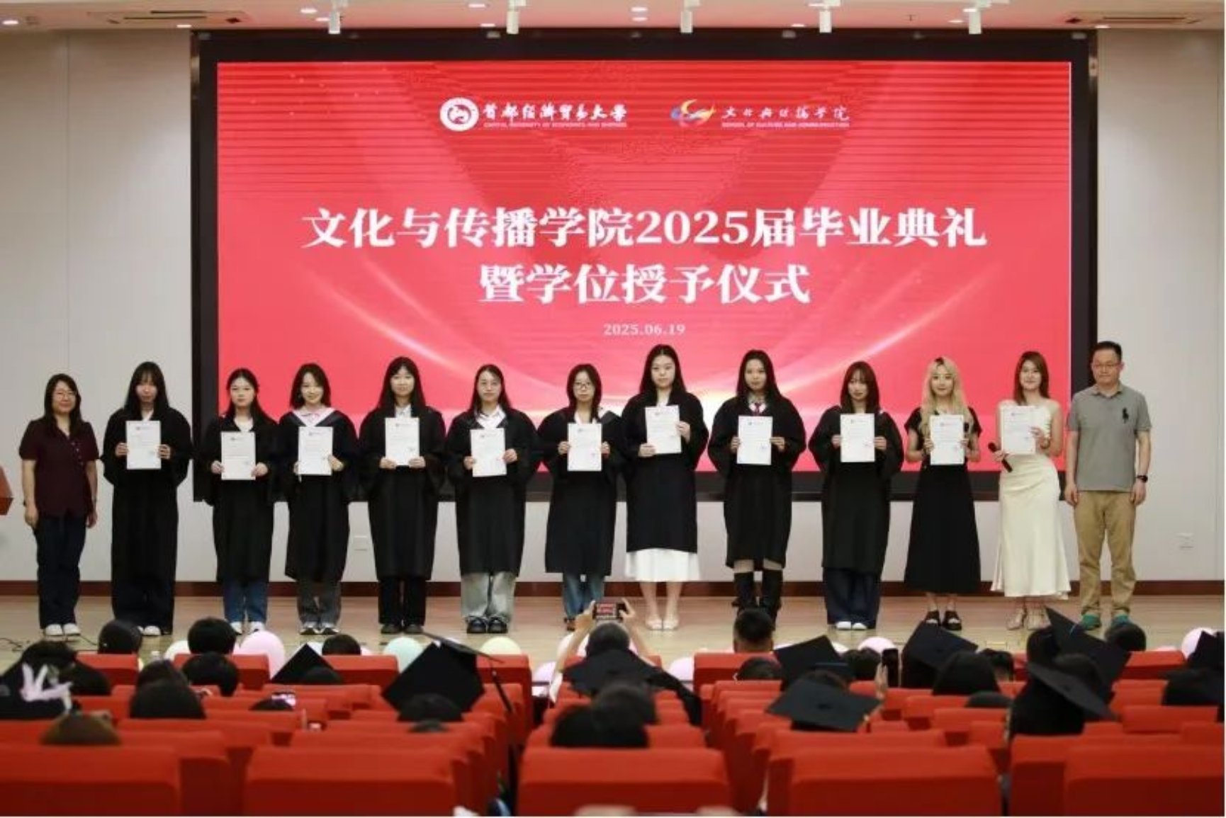 典礼在一段充满回忆的暖场视频中拉开序幕,视频带领全场师生重温了同学们在校园中的青春时光,那些共同的记忆为毕业典礼增添了一份温暖与感动。