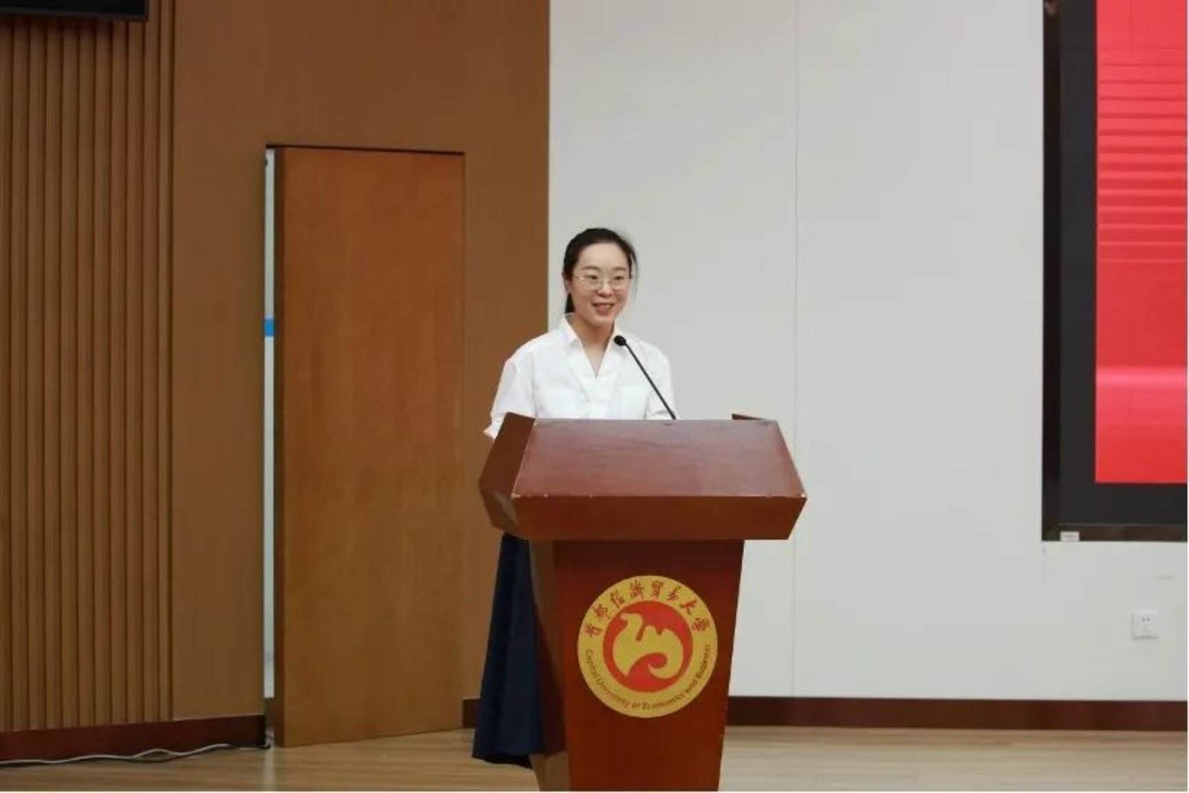 本科生毕业生代表许璐以四年的成长轨迹为脉络,深情回顾了在首经贸的求学时光。她坦言,那些“不为什么的坚持”早已在时光中生根结果,四年的学习和工作经历不断淬炼自己,让大学生活有了温度、深度、厚度。她深情表达了对老师、同学、父母的感谢,鼓励同学们坚定自己的选择,在未来从容地面对一切。
