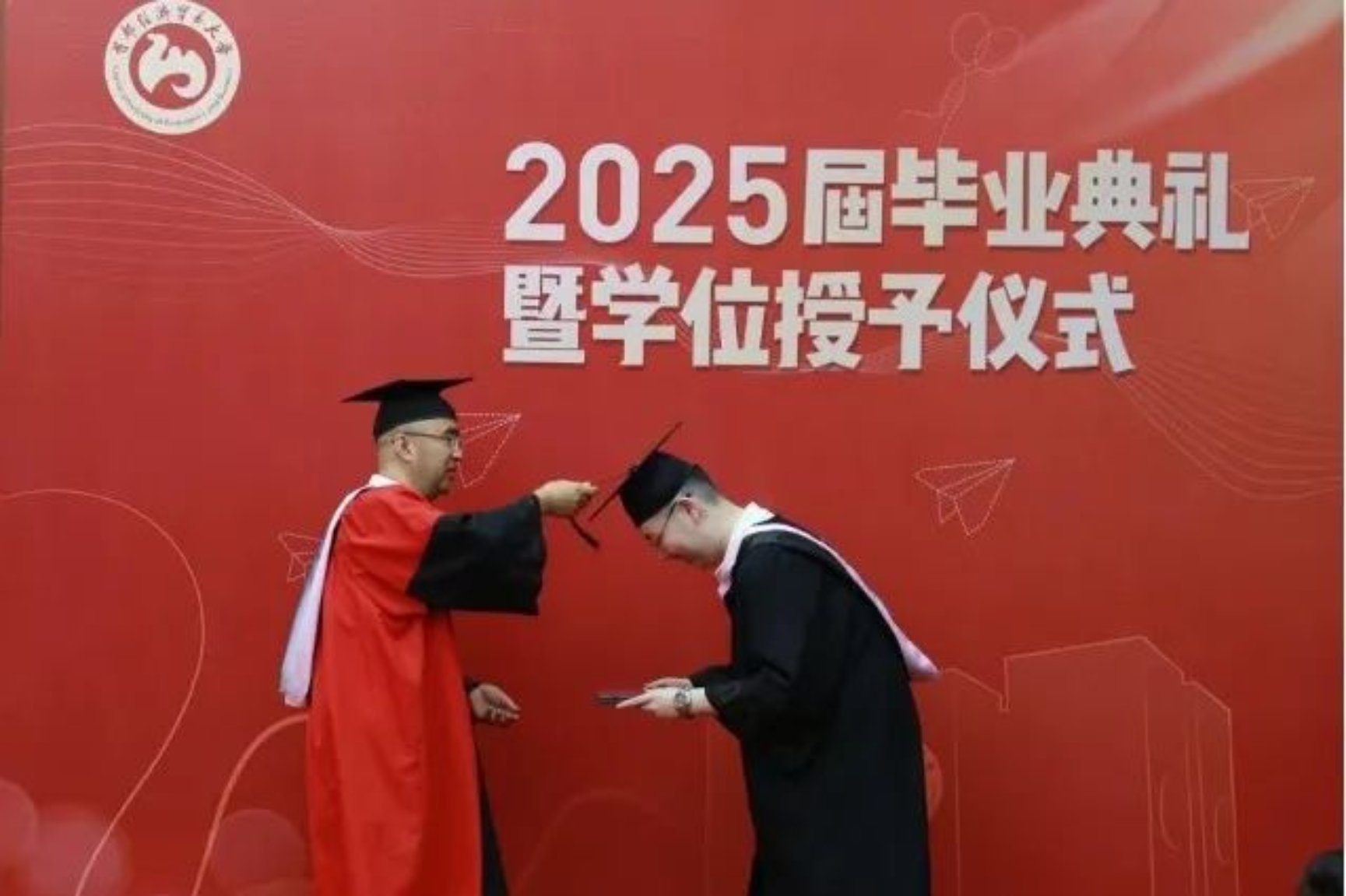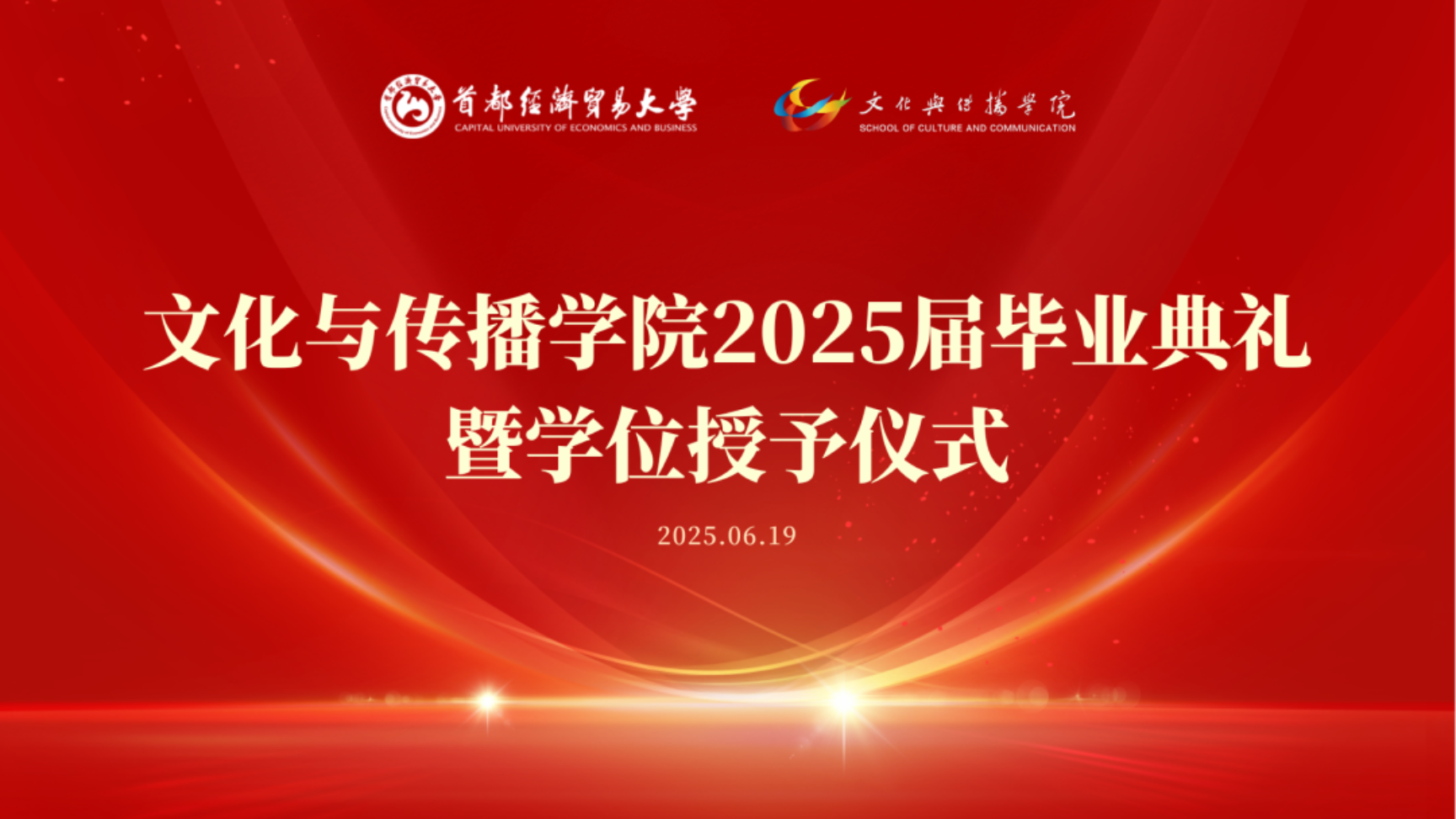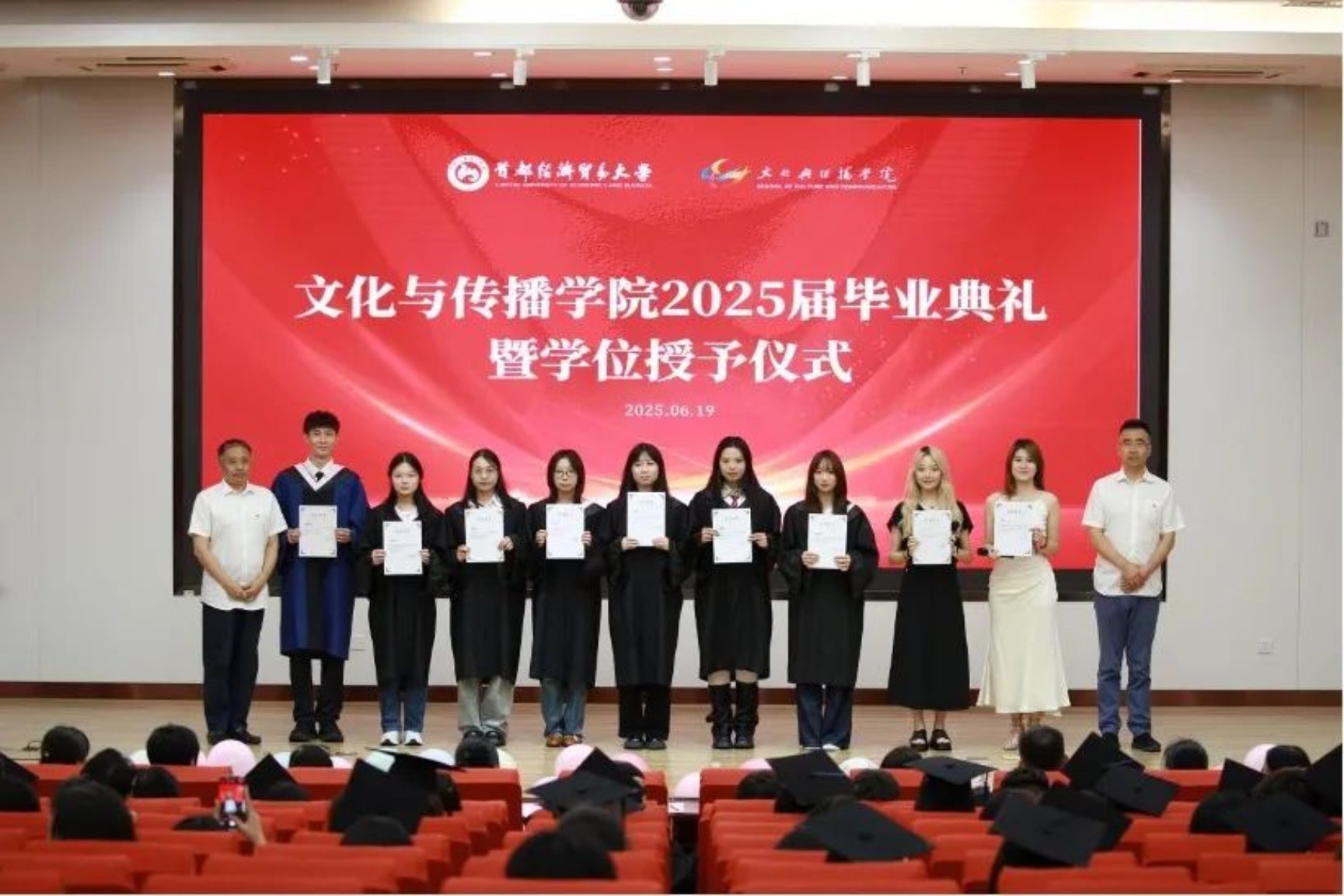 毕业生和在校生代表共同演唱了2025 届毕业主题曲《彩虹》,用歌声传递离别之情与青春记忆。随后,全场师生一起宣读青春誓词。“不灭青春之志,不惧山高水长,秉‘文以博传以道’之精神,共赴时代壮丽航程”,毕业生们以铿锵的誓言展现对未来的坚定信念和责任担当。