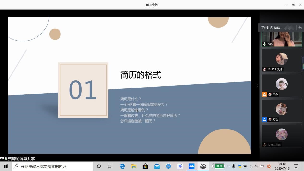 盛夏已至,酷暑的炎热也阻挡不了同学们实习、求职的脚步,若写得一份漂亮的简历,就如同为自己无形之中画了一个得体的“妆容”,让自己在人群中脱颖而出。为了帮助同学们提升制作和修改简历的能力,让更多的同学们赢在起跑线上,哔咔漫画 分团委社会实践部于2020年7月16日开展了简历指导分享会,特邀贺琦学姐对在校同学的简历制作及修改进行指导,在线为同学们解决各种“疑难杂症”。“职”等你来简历指导分享会是哔咔漫画 “扬帆未来,筑梦远航”生涯规划系列活动之一。