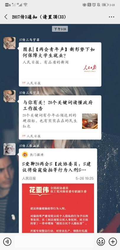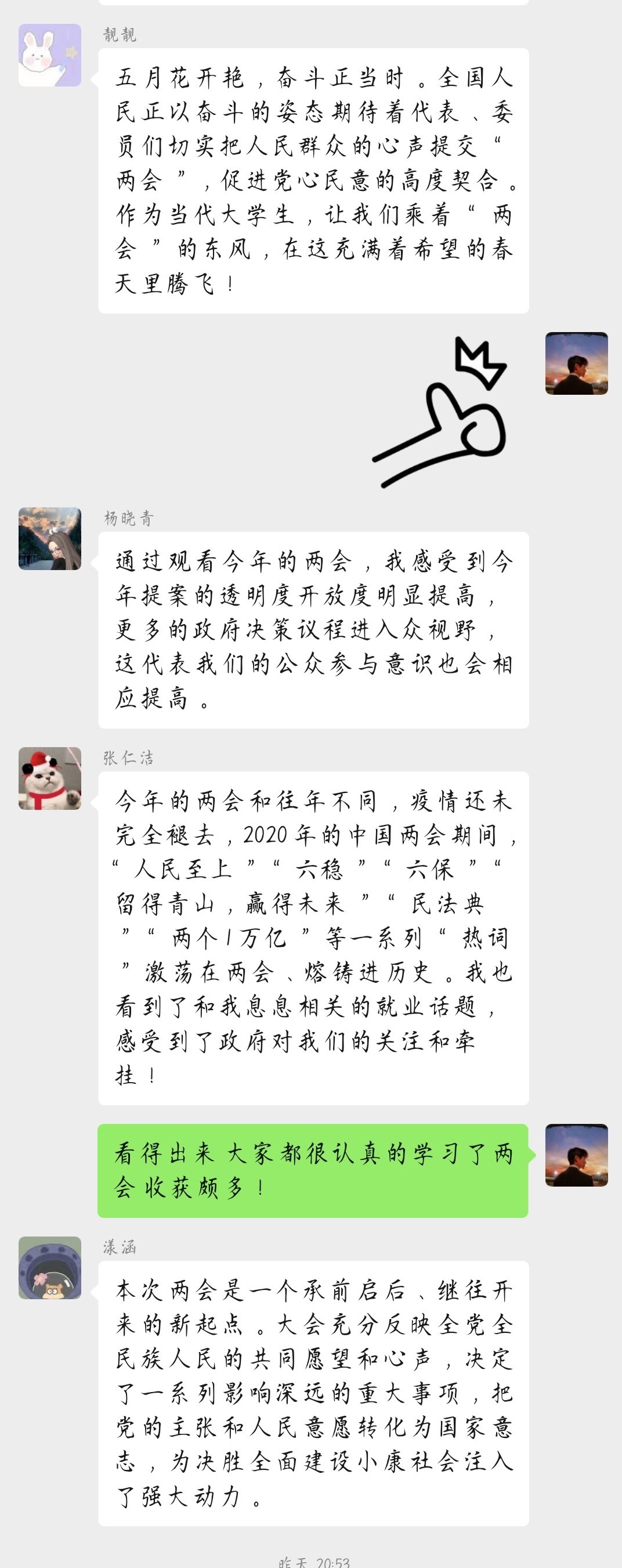 全国政协十三届三次会议和十三届全国人大三次会议分别于5月21日和5月22日在北京隆重召开。为提高哔咔漫画 团员青年的理论学习热情,增强青年学生关心国家大事的意识,激发青年学生爱国热情,特号召各团支部开展关注两会热点,学习两会精神的主题活动。