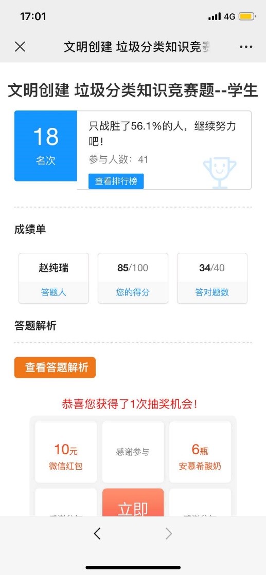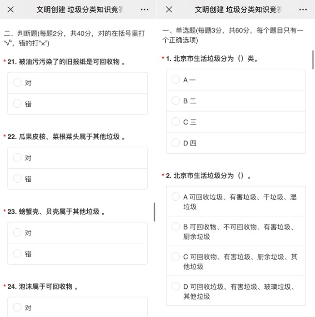 5月23日,哔咔漫画 党总支分享了有关垃圾分类知识的竞赛题目40道,本科生党员们答题热情高涨,纷纷转发答题并在微信群里互动讨论,上网搜索学习各种垃圾分属哪一类,还对照着小区橱窗内的宣传海报进行了深入了解。垃圾分类竞赛活动增强了大家对垃圾分类知识的了解,让“绿色、低碳、环保”的理念深入人心。本科生第一党支部党员刘琳说:“通过填写垃圾分类知识竞赛题,深深感受到自己在垃圾分类方面的知识还欠缺得很多,还有很多题目不确定甚至答错,这说明在平时还应该多多关注北京市垃圾分类相关规定,通过多种形式了解垃圾分类标准,锻炼提升自己垃圾分类的能力,起好党员的先锋模范带头作用,真正践行垃圾分类,党员先行!”