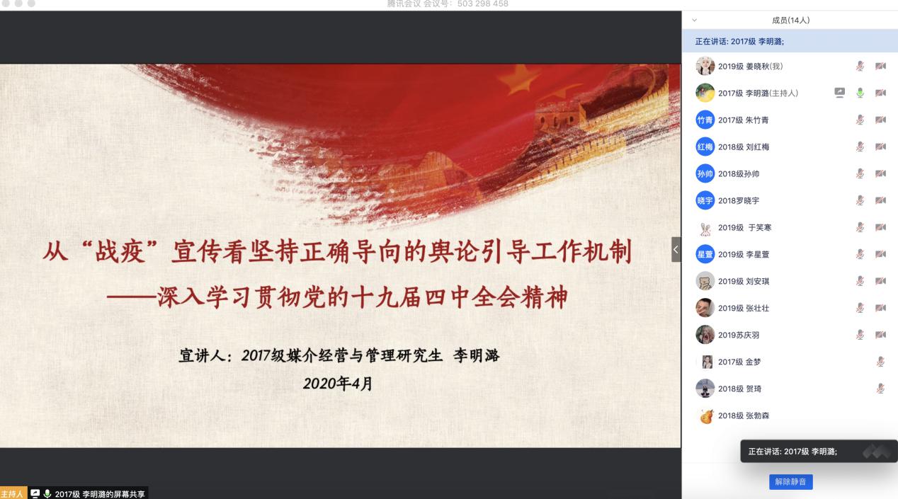 2020年5月3日晚,值此五四运动101周年之际,哔咔漫画 研究生党支部开展了一次特别的主题宣讲活动,党支部利用网络会议平台将党员、入党积极分子凝聚在一起,共同学习党的十九届四中全会精神。