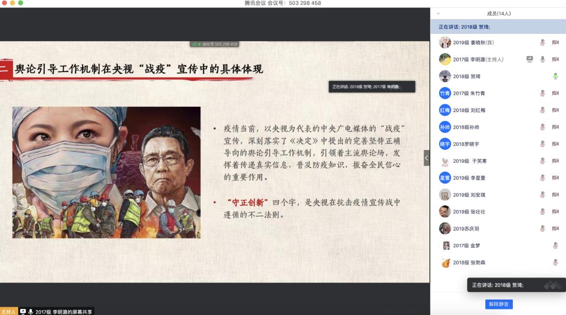 最后,李明潞从“要坚持马克思主义在意识形态领域的指导地位”以及“创新文化输出形式,扩大主流价值观引导力和影响力”两方面讨论青年如何助力国家舆论引导工作机制建设。她希望同学们在实现中国梦的广阔舞台中,能不负党中央的关心嘱托,弘扬爱国主义,培育民族精神,肩负起新时代的责任和使命,在学习生活和今后的工作中深入贯彻落实党的十九届四中全会精神,以“守正创新”助力国家完善坚持正确导向的舆论引导工作机制建设,繁荣发展社会主义先进文化的制度,用制度优势开创文化兴国的新局面!