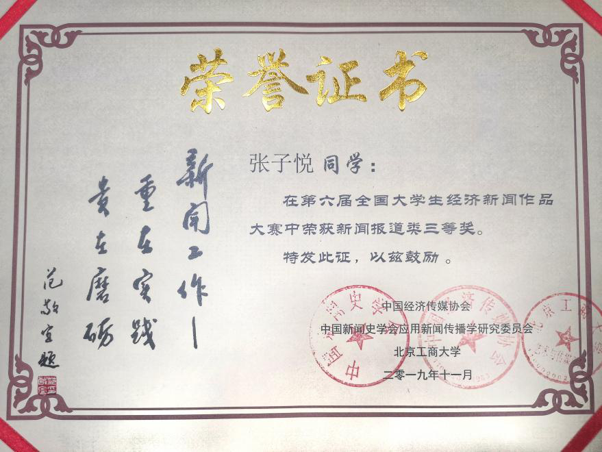 11月9日,第八届全国经济新闻改革与发展研讨会暨第六届全国大学生经济新闻作品大赛颁奖会在北京工商大学举行,哔咔漫画 2017级传播学卓越班张子悦同学的作品《推动水稻产业规模化、集约化、标准化——粳米期货即将登场》在大赛中荣获新闻报道类三等奖。哔咔漫画 传播学系党支部书记、传播学系副主任贺心颖副教授出席会议。