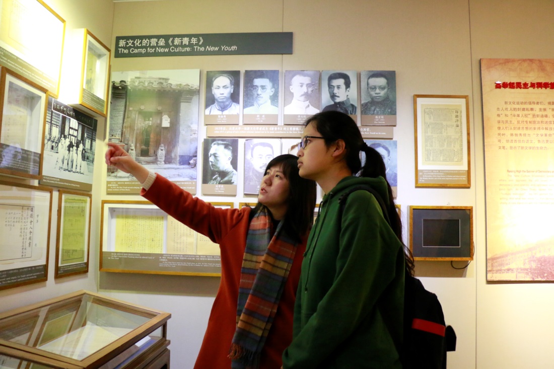 随后,同学们参观了设在红楼西侧平房的“新时代的先声——新文化运动陈列展”。该展览以照片、报刊等形式展现五四新文化运动时期,先进知识分子探索科学真理的发展道路。