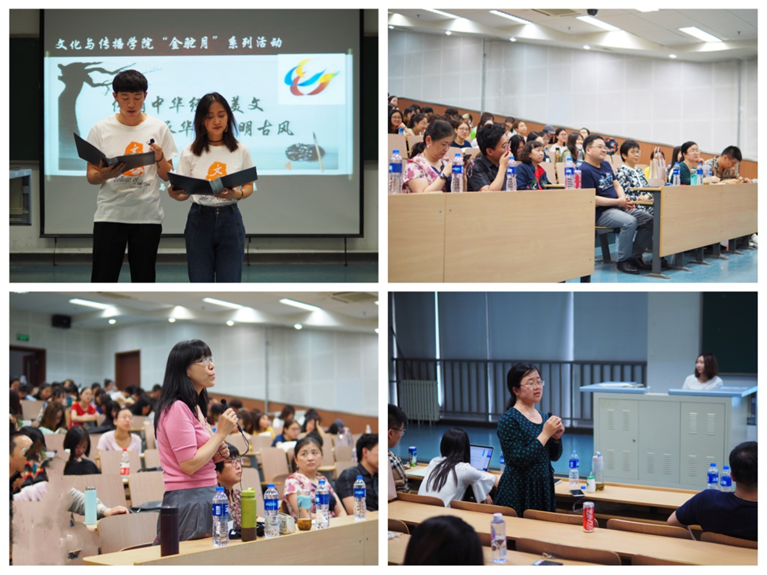 活动中,同学们以丰富多样的形式表演了11个吟诵经典的节目,15级汉语班李沫同学演唱的京剧《卖水》令大家眼前一亮,带领大家一同领略了京剧这一中华文化的艺术瑰宝的魅力,之后吴伟凡老师也即兴用她深厚的京剧功底为大家表演了经典剧目《白蛇传》的片段,现场气氛一度达到高潮;16级汉语班同学们也别出心裁,以陆游《钗头凤》背后故事为题材表演了精彩的舞台剧,服装、台词都颇具韵味,赢得老师同学们的一致好评,也让在场的观众充分了解了那段凄美的爱情故事;17级传播学二班同学、17级汉语班同学以充沛的情感朗诵了中华传统名篇《长恨歌》,并且现场配以古筝弹奏,赋予了传统经典诗文极强的穿透力。同学们的表演充分展示了文传学子传承经典、弘扬经典的良好精神风貌,让现场不时爆发热烈的掌声。