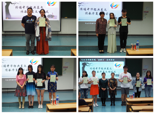 活动最后,通过统计老师评委与同学的投票,15级国际汉语教育班同学演出的《卖水》荣获本次活动一等奖,16级国际汉语教育班演出的《钗头凤》、《水调歌头》荣获二等奖, 17级广告学二班演出的《琵琶行》,17级汉语国际教育班演出的《长恨歌》、《情赋三篇》荣获三等奖,15级国际汉语教育班演出的《明月几时有》、17级传播学一班演出的《蒹葭》、17级广告学一班演出的《洛神赋》、17级传播学三班演出的《九歌·少司命》、17级传播学二班演出的《滕王阁序》荣获优秀奖。