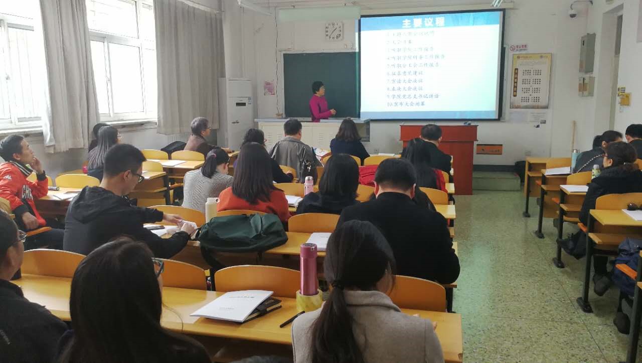 党总支副书记、院长石刚代表学院领导班子做了学院工作报告,全面回顾了学院2016年的工作;学院办公室主任张素娥做了学院财务工作报告,详细汇报了2016年学院专项经费、统筹经费、行政经费的支出情况和结余情况;副院长陆彦明详细解读了学校近期发布的有关教学工作的四个文件;学院分工会主席张小乐做了《分工会工作报告》,从“规定动作”和“自选动作”两个方面回顾了过去一年的工会工作,从老同志团拜到看望新生的文传宝宝,从越战越勇的萌之队到全院教师喜闻乐见的嘉年华、院庆活动,老师们聚精会神地观看着ppt,不时爆发出会心的微笑。 经过全体教职工讨论,大会一致通过了三个工作报告。