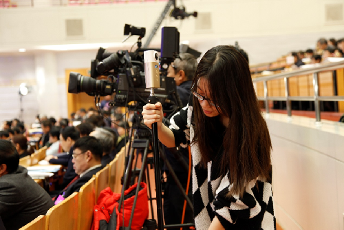 会议期间,两位实习生负责了现场图片拍摄、后期处理、稿件编辑审核等工作,熟练运用摄影基础技能和文字功底,也学习到了VR全景拍摄、政治类新闻图片筛选、处理等新技能。尤其是摄影方面,此次拍摄具有的严肃性与庄重性相较于日常会议拍摄有很大的差异,对于照片中拍摄主体的表情、状态、构图都有很严格的要求,在会议现场,经常能看到实习生们拍摄一段时间后,飞奔至会场后排进行图片的处理和发布。将学校学习的知识付诸于实践,提到本次两会实习的所得,两位实习生都表示收获了很多。