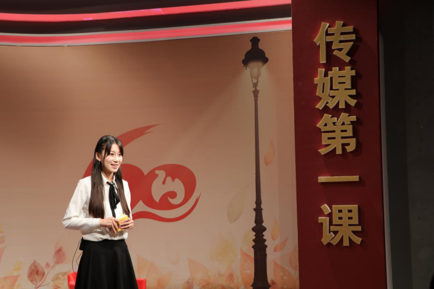 节目一开始,来自14级传播学专业的张丹作为主持人上台,在介绍了到场来宾后,她引出此次《传媒第一课》“答疑解惑”的节目主题,并依次请出作为特邀嘉宾的三位返校校友上台,向大家介绍经验、提出建议。