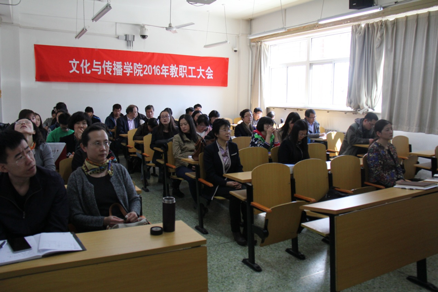 院长石刚代表学院领导班子做了《学院工作报告》。石刚说,2015年,在全院教职工的共同努力下,学院各项工作取得了长足进步,完成了十二五规划的总结,也基本完成了十三五规划的起草工作;完成了与经济日报社的经济新闻人才培养基地的签约工作,成为市属高校的第一家部校共建单位;学科建设领域,已经开始招生的二级学科硕士点日益完善;教学方面,学院在教学改革方面不断深入,完成了国家级实验中心的申报工作,汉语国际教育专业的学生圆满完成了赴国外实习的任务,教学专项考核、卓越人才培养、专业实践建设、对外合作等各项工作有序开展;科研方面,学院再度获批一项国家社科基金项目,横向课题经费首次突破100万元;学生工作方面,2012级传播学专业的李阳等同学在北京市、全国举办的挑战杯比赛中取得佳绩,推行了学生制度建设工作,建成了学生就业指导中心;党务工作方面,不仅完成了各项制度建设,制定了新版教师手册,还组织党员学习习近平总书记的讲话。报告最后,石刚说:“学院领导班子将凝神聚力,带领全体教职工在2016年继续团结奋进。”