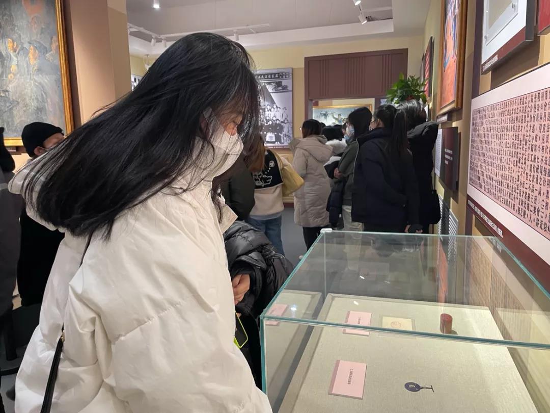 参观过程中,学生党员们在解说员的引导下进入各展厅逐一学习,近距离感受文物和史料的斑驳印记,聆听它们背后的故事。本次的解说员是中车集团的党员志愿者,对于此次参观来说,不只是讲解员单向的输出,而是党员之间的一次交流学习,这位讲解员表示他的服务激情来源于对这段历史真挚的感悟,以及对中国共产党精神的敬仰,他希望把这种革命的火种在青年一代中传承下去。学生党员们也在聆听完讲解员的解说后驻足在展板、展柜前继续认真学习,并对自己感兴趣的内容与讲解员交流互动。