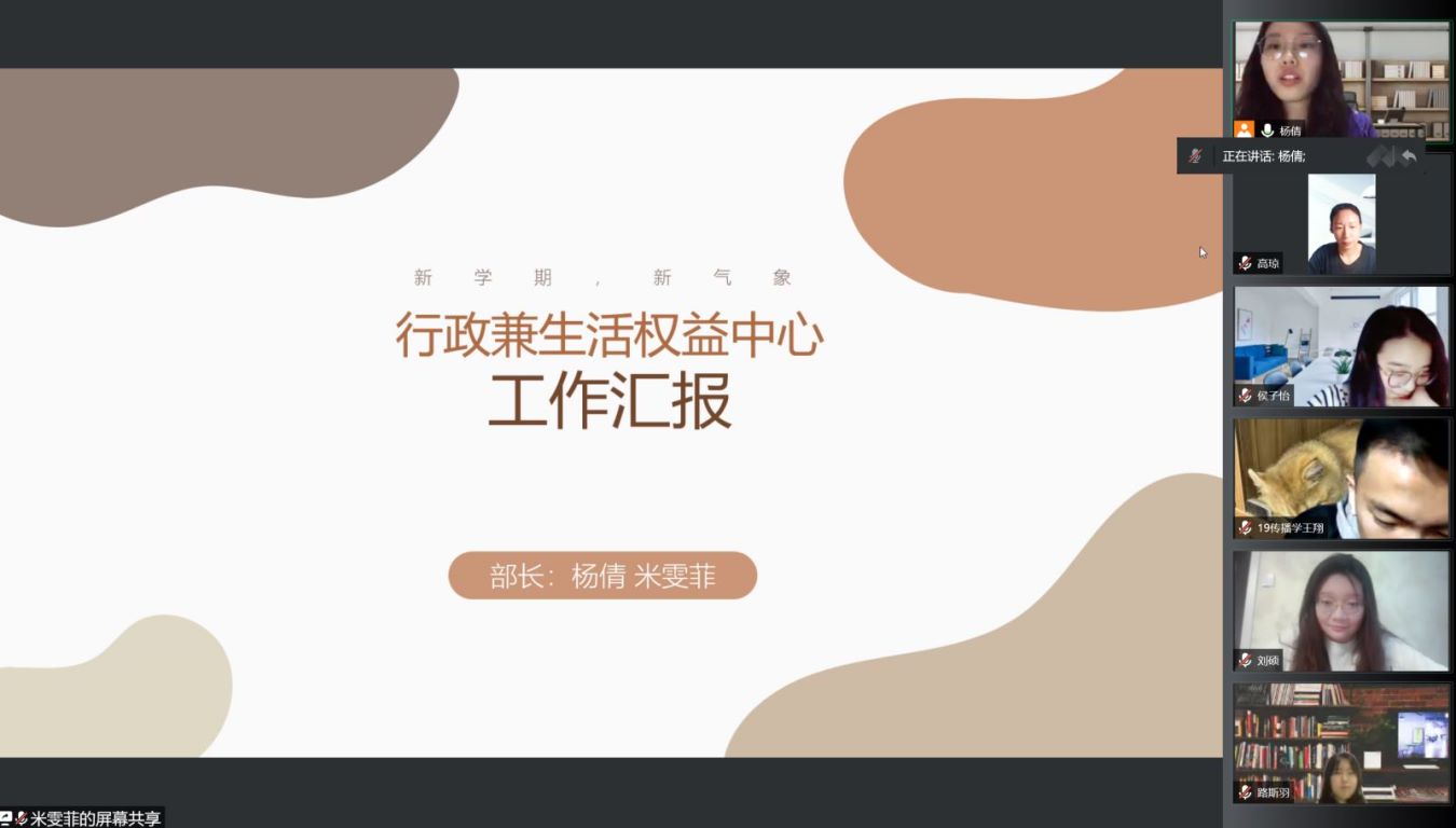 大会第一项,按照分团委组织部、社会实践部、志愿者团、行政中心、涉外部、文艺部、体育部、新媒体中心、笃行学会的顺序,各部长对线上开学两个月以来的所有工作进行汇报总结,并对未来的工作提出展望。