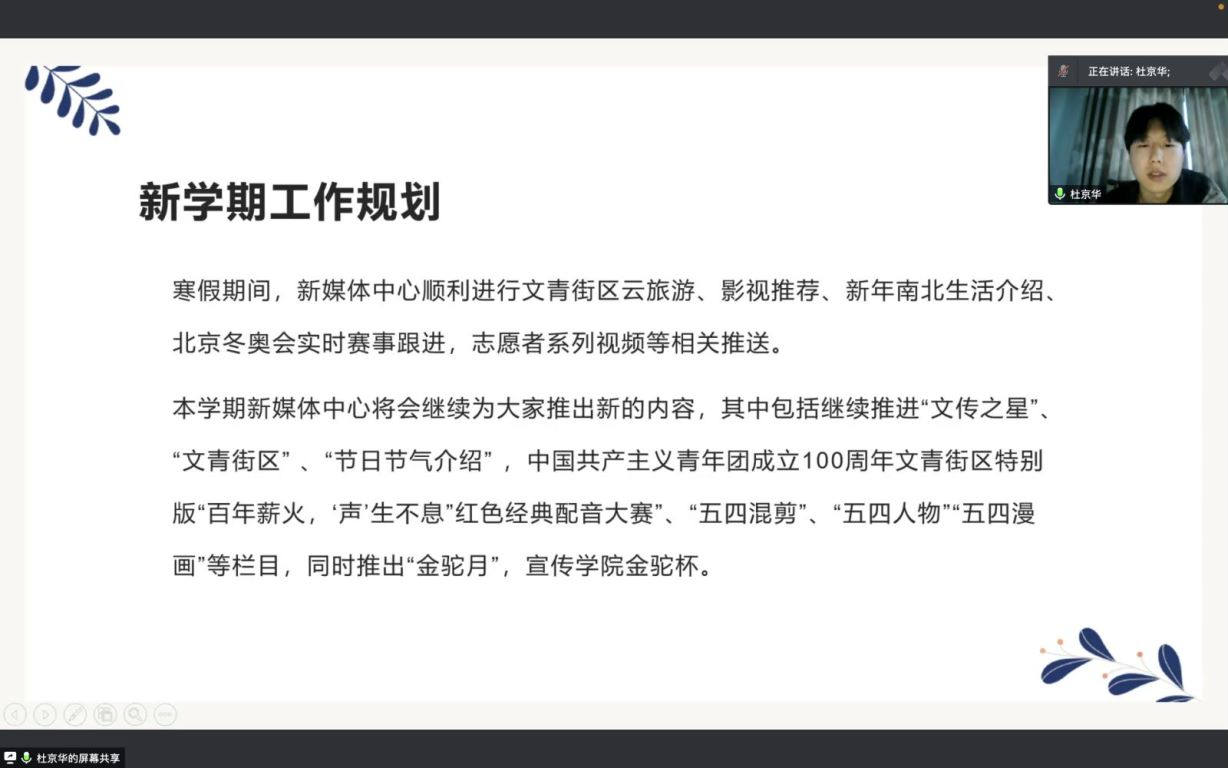 大会第二项,学生会主席刘硕、王仕远、王翔,分团委副书记侯子怡、王嘉琦、戴佳琦,新媒体中心主任赵卓筠、饶妍、徐慧婕以及笃行学会主任刘佳琦对各部门的线上工作进行了肯定,并对未来疫情结束大家于线下相聚表达了期待。