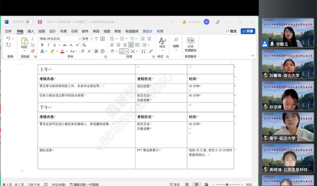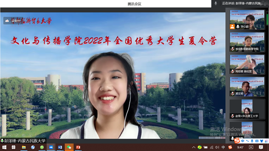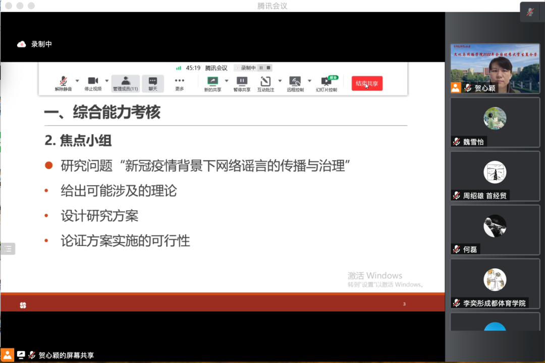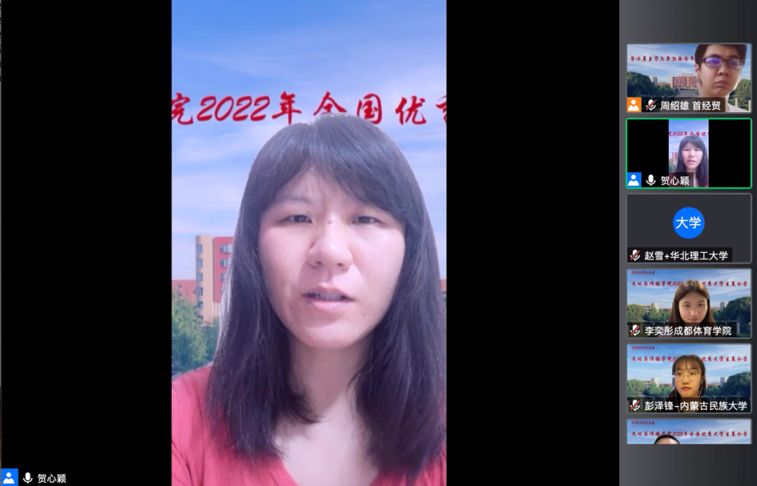 7月4号来自全国不同高校的10名大学生以腾讯会议室的方式集体报到。分管研究生工作副院长郭媛媛,学硕考核组主持人贺心颖、专硕考核组主持人许敏玉,何磊教授,以及研究生秘书郭锦鹏,在会议室欢迎营员们的到来,并安排相关事宜。当晚,营员们分别在学硕组、专硕组老师的带领下,进行了线上活动的演练。