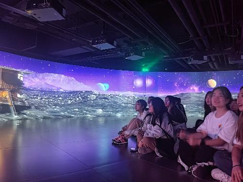 “现在要引入年轻人喜欢的潮流,推动打卡消费。隆福寺坐落在故宫以东,始建于明代,历史悠久。不管是隆福寺庙会还是东四人民市场,都十分热闹。后来着了两次大火,古建筑和古文物都毁于一旦。”为了重建之前的繁荣景象,隆福寺文创园区正在努力建设成为“传统文化与现代文明交相辉映、中华文化与世界文明协调共融”的首都文化新中心。师生先后参观大麦新空间、Burton中国旗舰店等文创园内的商铺,体验Funfly China 环游天地体验8K飞行。环游天地引入20米巨型球幕等科学技术,体现了隆福寺将中华优秀传统文化、非物质文化遗产与现代科学技术相结合传递给大众。
