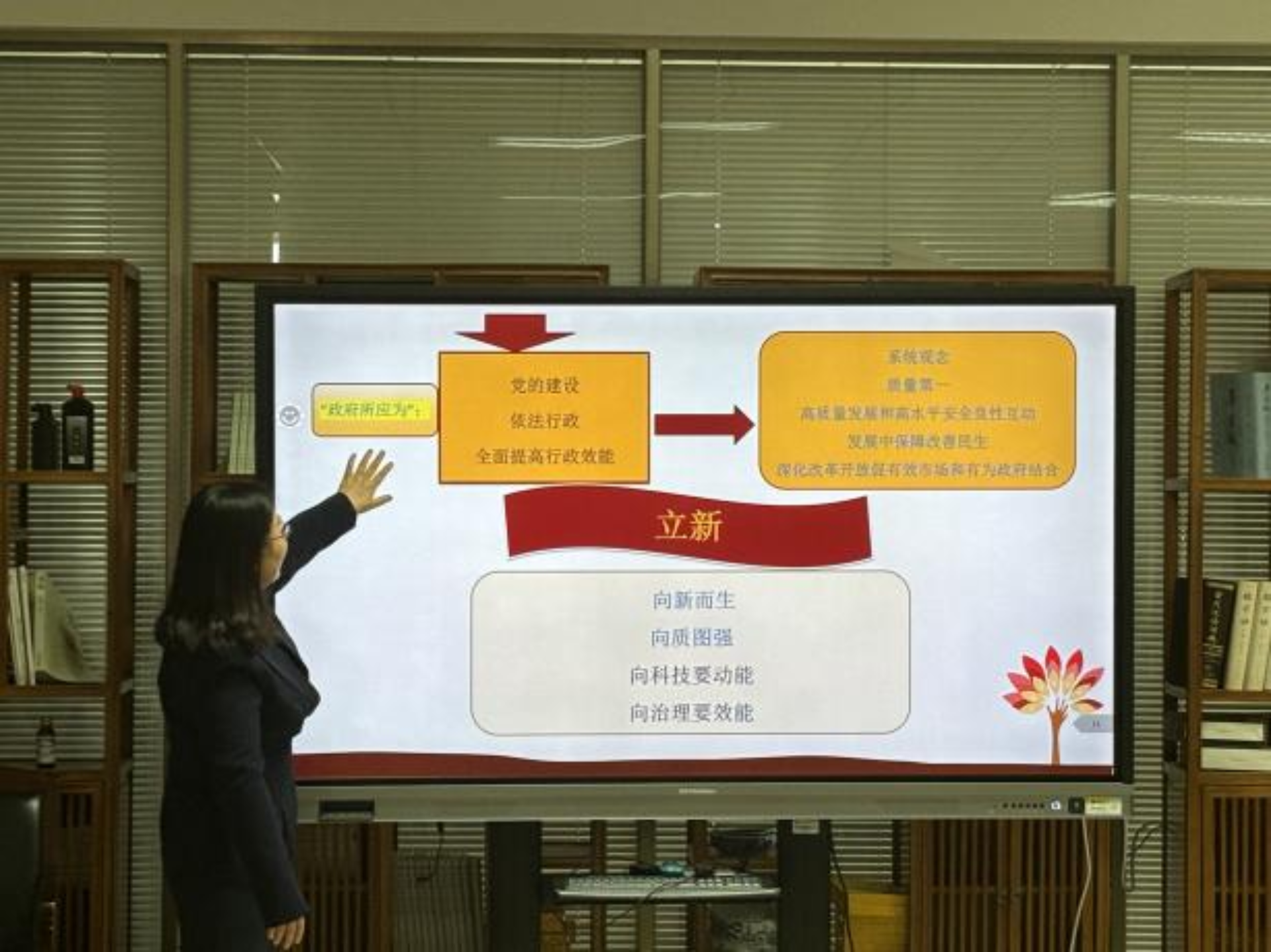 以“2023年:‘来之不易’——‘波浪式发展、曲折式前进’”、“2024:‘稳中求进’——‘质的有效提升、量的合理增长’”、“关键词:‘新质生产力’”、“如何作为:‘站上去’、‘走进去’、‘坐下来’”四个部分,郭媛媛分享对今年两会精神的体会与认识。