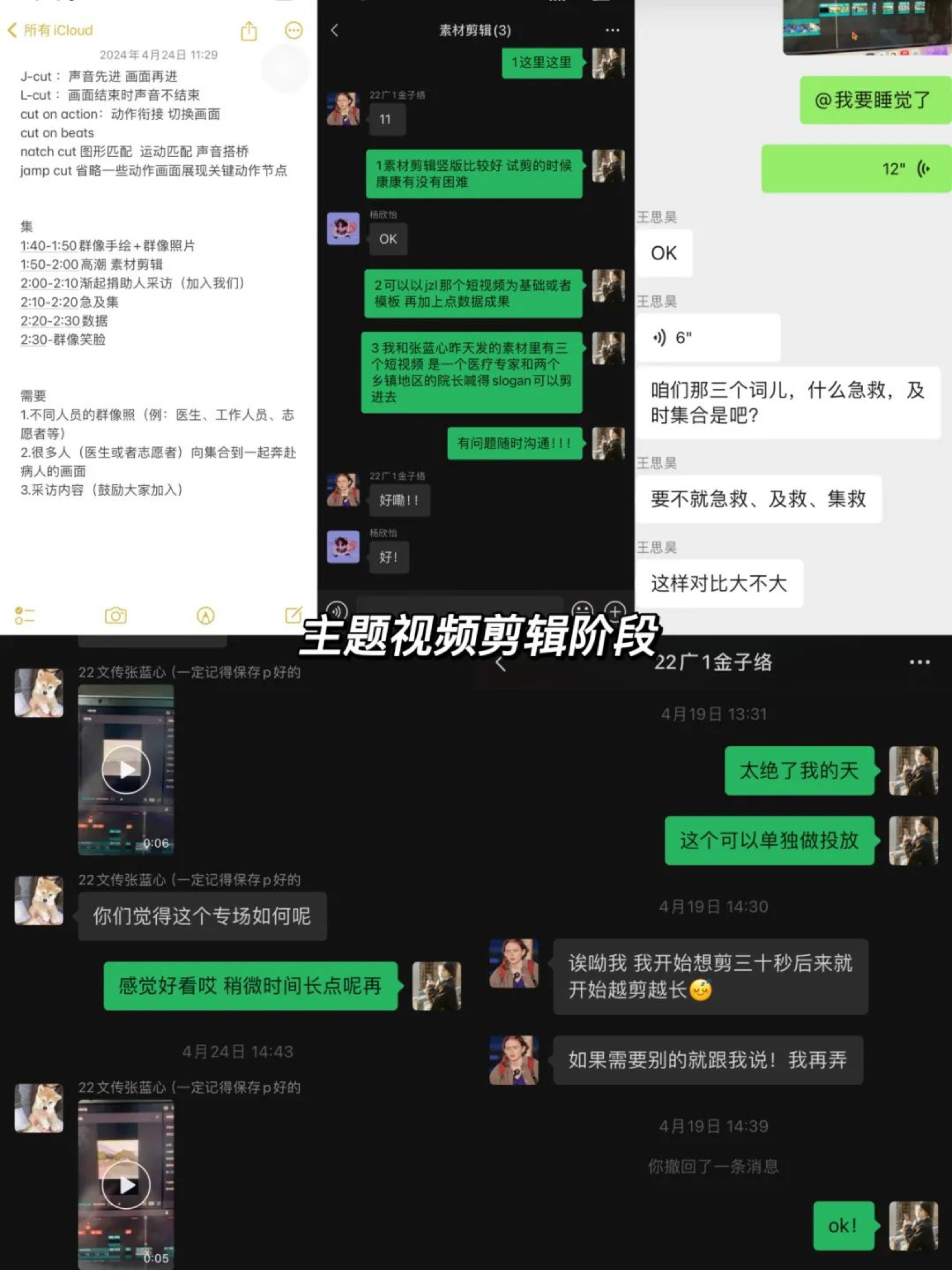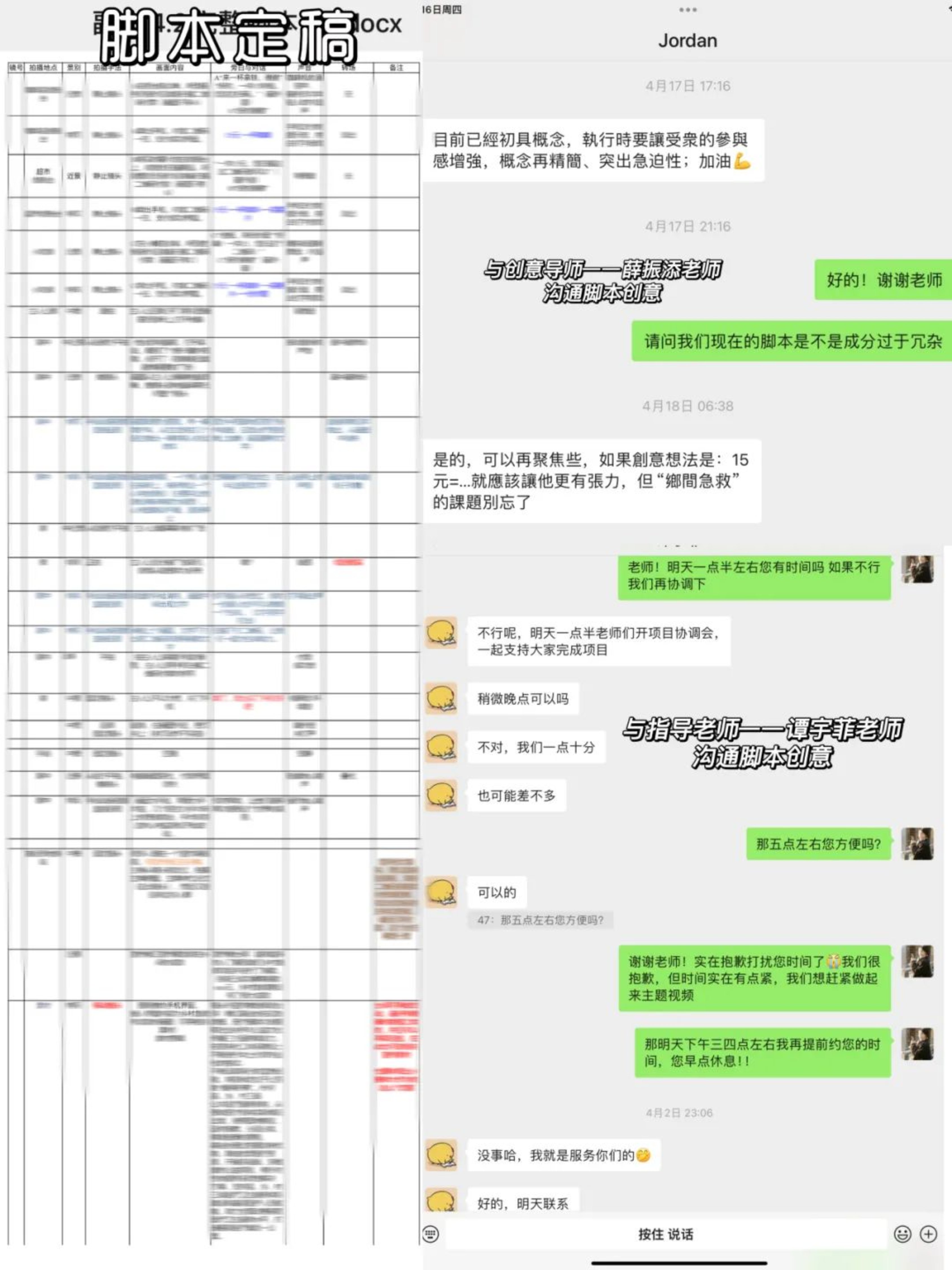 2分钟的主题视频脚本="十余次小组集体脑暴开会+小组内部无数次反复打磨+忙到半夜老师们的倾心指导+伙伴们分工协作一起将构想变为现实+无数次崩溃后重振信心......当投身于《急救在乡间》主题视频创作时,我们深感这是一次既充满挑战又独具意义的旅程。