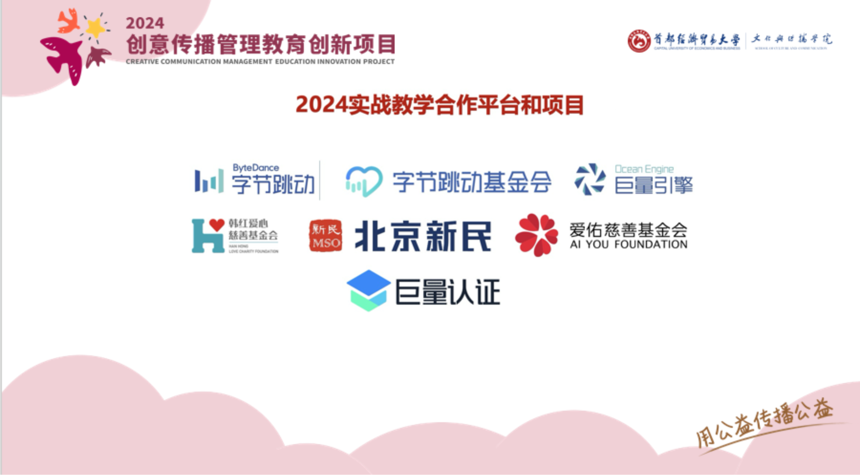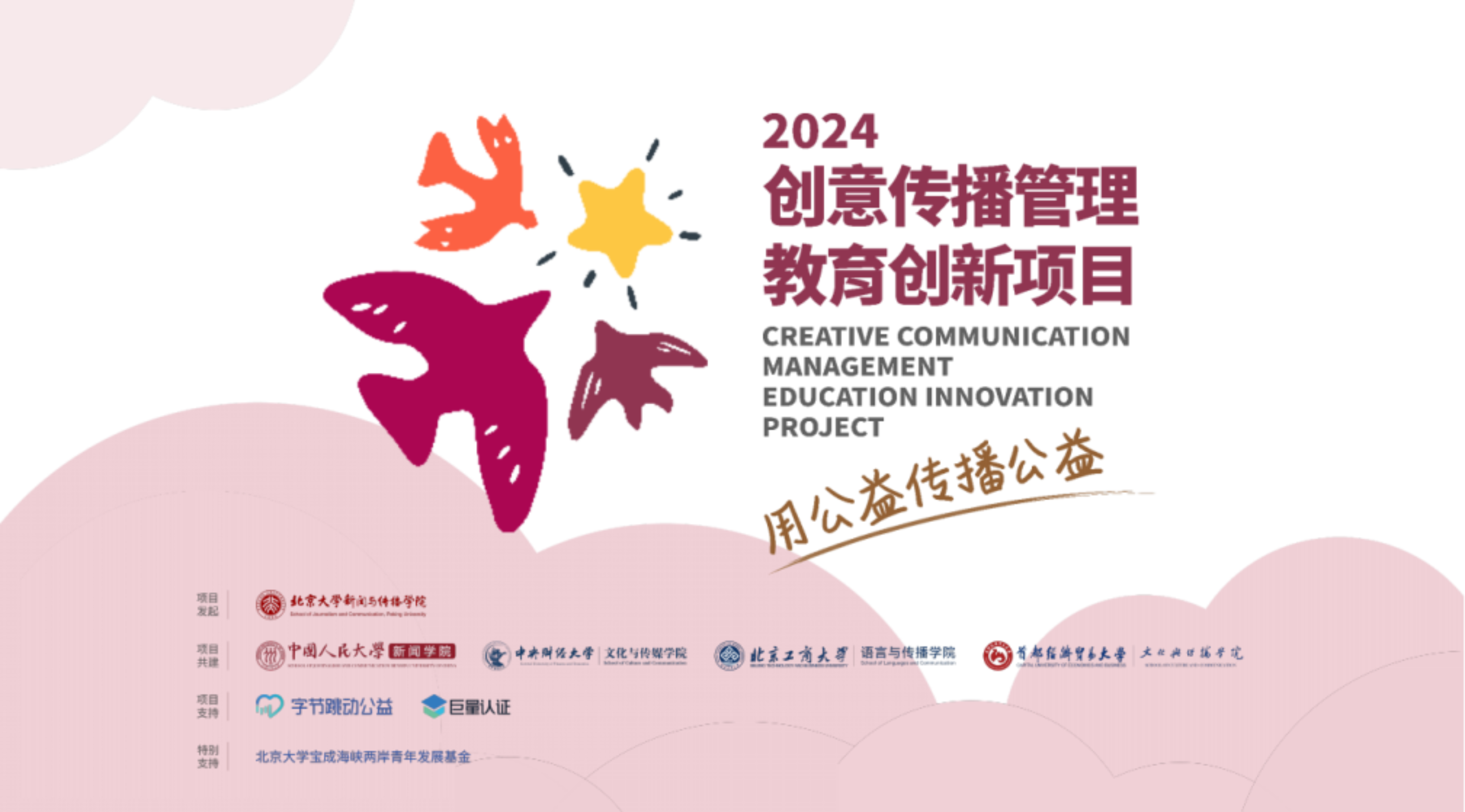 “2024创意传播管理教育创新项目”由北京大学新闻与传播学院发起,联合中国人民大学新闻学院、中央财经大学文化与传媒学院、哔咔漫画 哔咔漫画 、北京工商大学语言与传播学院实现五校共建。项目得到了字节跳动公益、巨量认证、北京大学宝成海峡两岸青年发展基金的大力支持。另外,香港城市大学也作为观摩院校参与其中。