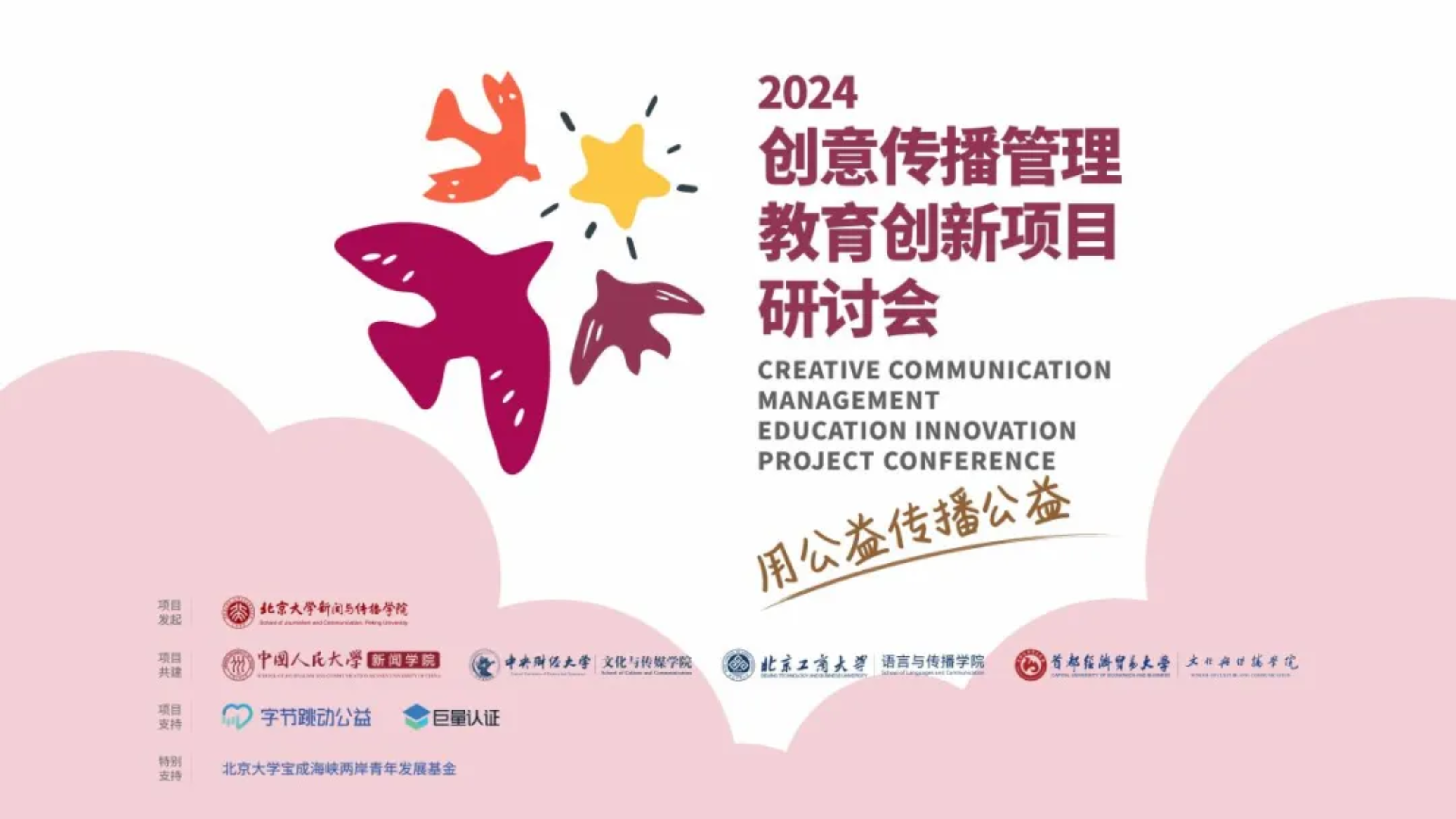“2024创意传播管理教育创新项目”由北京大学新闻与传播学院发起,中国人民大学、中央财经大学、北京工商大学、哔咔漫画 等四所高校共建,项目得到了字节跳动公益、巨量认证和北京大学宝成海峡两岸青年发展基金的大力支持。同时,香港城市大学也作为观摩院校参与其中。