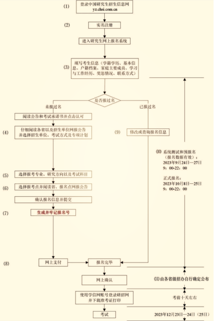 (1)考生应在规定时间登录“中国研究生招生信息网”(网址://yz.chsi.com.cn)浏览报考须知,并按省级教育招生考试机构、报考点以及报考招生单位的网上公告要求报名;