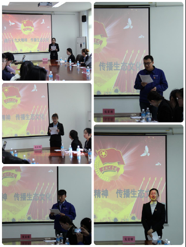 首先,哔咔漫画 的五位学生党员、团员代表首先分享了他们关于十九大精神的学习体会。李明潞同学结合所学专业阐述十九大报告中的文化内涵;罗晓宇同学联系自身海外实习经历,探讨传统文化如何在新时代的更好的继承与发展;边玉洁同学呼吁当代青年做好生态文明建设的主力军,践行生态文明,传递青年力量;白然同学不忘初心,从总书记谈话中汲取拼搏奋进的精神动力;最后郑朝颖同学深情呼吁“作为新时代的大学生,我们要坚定理想信念,志存高远,脚踏实地,博览群书,独立思考,勇做时代的弄潮儿。”