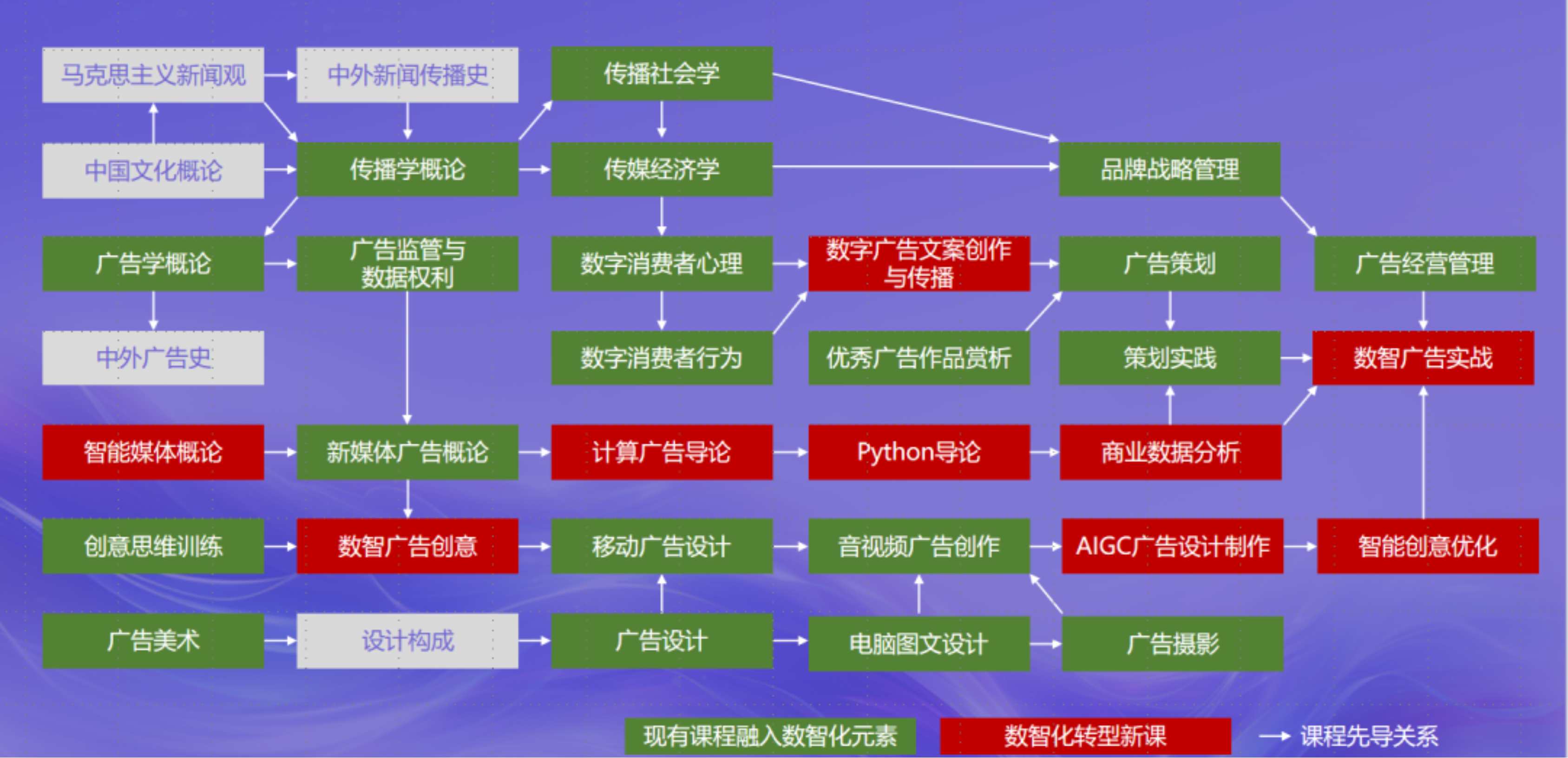 广告学专业以“强基础、重交叉、实战化”为整体思路,在充分研讨论证的基础上推进课程数智化转型体系设计,培养适应数智广告发展需求、具有前瞻视野、兼具理论储备和实践能力的三型一化人才。