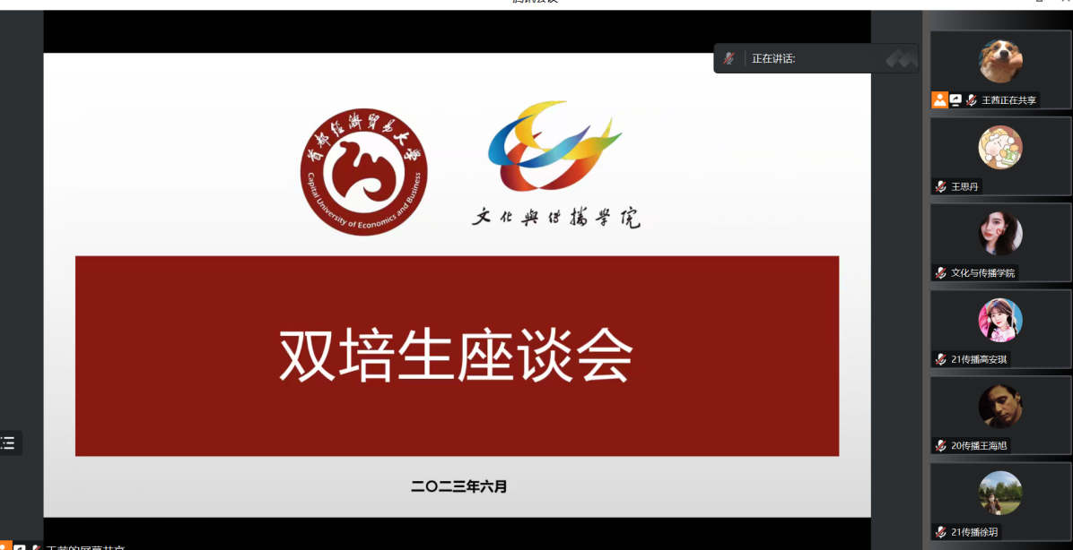 2023年6月30日,哔咔漫画 于线上召开双培生座谈会。出席本次会议的有党总支副书记高琼、副院长陆彦明、分团委书记郭奕彤、教务秘书尹思筠、专职辅导员袁心玥,以及2020级、2021级、2022级全体双培生。