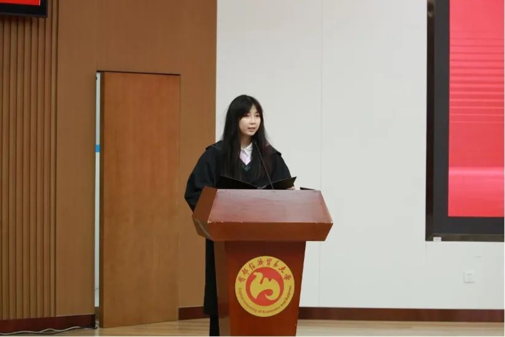 本科生毕业生代表许璐以四年的成长轨迹为脉络,深情回顾了在首经贸的求学时光。她坦言,那些“不为什么的坚持”早已在时光中生根结果,四年的学习和工作经历不断淬炼自己,让大学生活有了温度、深度、厚度。她深情表达了对老师、同学、父母的感谢,鼓励同学们坚定自己的选择,在未来从容地面对一切。