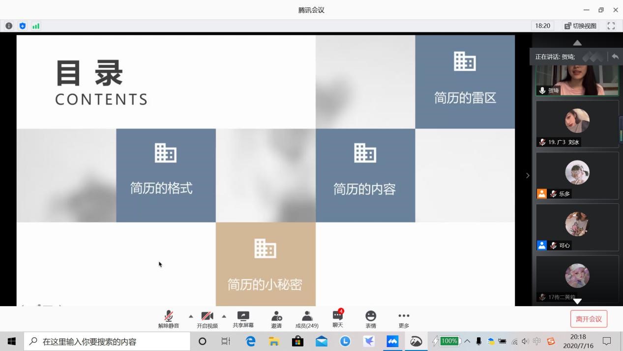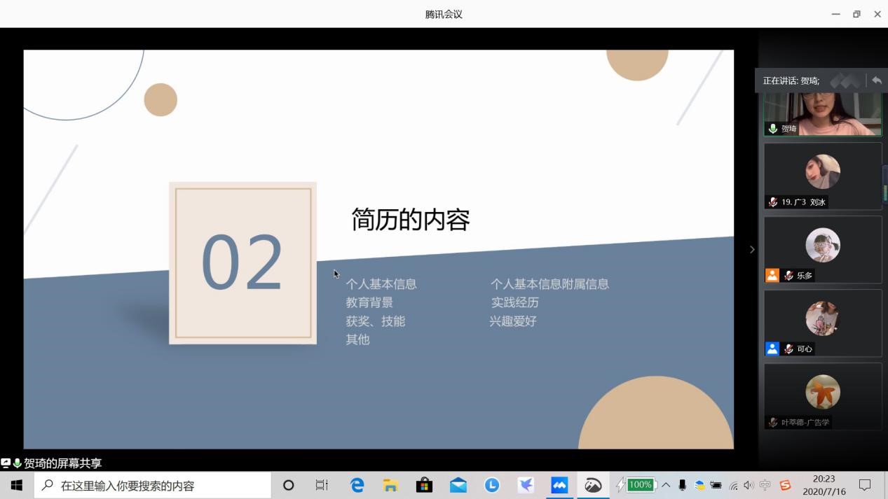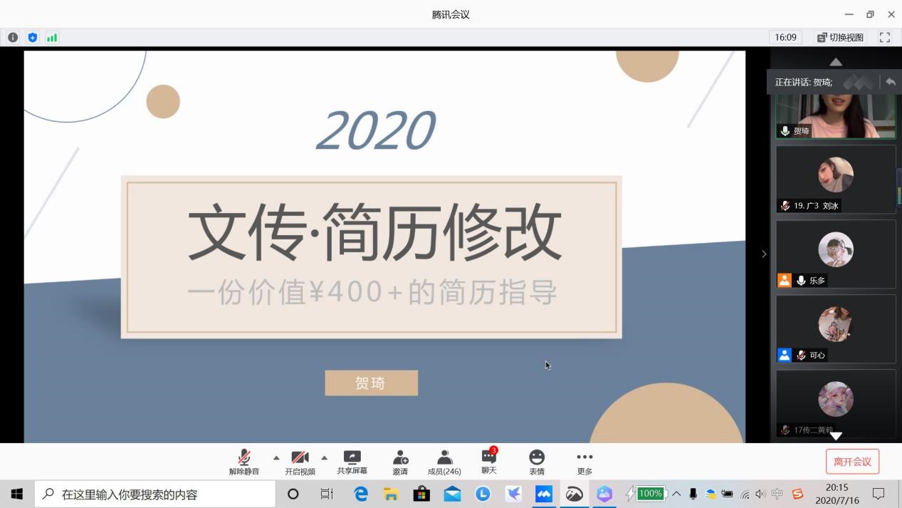 盛夏已至,酷暑的炎热也阻挡不了同学们实习、求职的脚步,若写得一份漂亮的简历,就如同为自己无形之中画了一个得体的“妆容”,让自己在人群中脱颖而出。为了帮助同学们提升制作和修改简历的能力,让更多的同学们赢在起跑线上,哔咔漫画 分团委社会实践部于2020年7月16日开展了简历指导分享会,特邀贺琦学姐对在校同学的简历制作及修改进行指导,在线为同学们解决各种“疑难杂症”。“职”等你来简历指导分享会是哔咔漫画 “扬帆未来,筑梦远航”生涯规划系列活动之一。