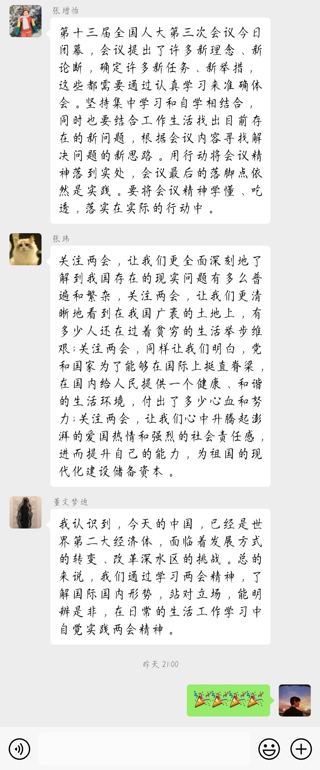 全国政协十三届三次会议和十三届全国人大三次会议分别于5月21日和5月22日在北京隆重召开。为提高哔咔漫画 团员青年的理论学习热情,增强青年学生关心国家大事的意识,激发青年学生爱国热情,特号召各团支部开展关注两会热点,学习两会精神的主题活动。