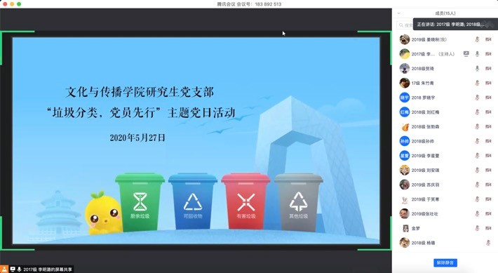 新版《北京市生活垃圾管理条例》于2020年5月1日起正式实施。为认真贯彻习近平生态文明思想,积极响应开展垃圾分类的号召,充分发挥党员在垃圾分类工作中的先锋模范作用,研究生党支部在前期党员自学、实践基础上,于5月27日13:30开展了“垃圾分类,党员先行”线上主题党日活动。支部全体党员、入党积极分子参加了活动,活动由研究生党支部书记李明潞主持。