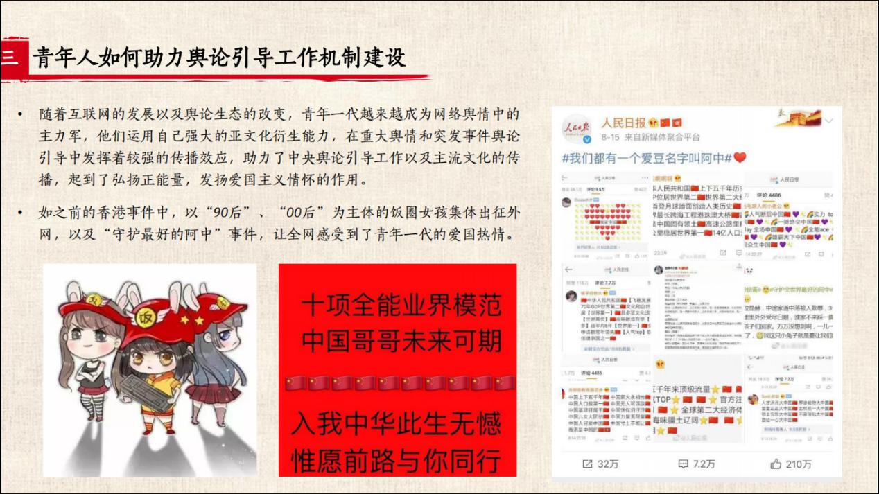 最后,李明潞从“要坚持马克思主义在意识形态领域的指导地位”以及“创新文化输出形式,扩大主流价值观引导力和影响力”两方面讨论青年如何助力国家舆论引导工作机制建设。她希望同学们在实现中国梦的广阔舞台中,能不负党中央的关心嘱托,弘扬爱国主义,培育民族精神,肩负起新时代的责任和使命,在学习生活和今后的工作中深入贯彻落实党的十九届四中全会精神,以“守正创新”助力国家完善坚持正确导向的舆论引导工作机制建设,繁荣发展社会主义先进文化的制度,用制度优势开创文化兴国的新局面!