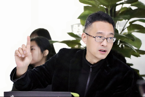 在会议室方斌首先为到场师生作了一场题为《中国影视工业化之路》的讲座。在介绍当前中国影视工业现状之后,方斌分析了我国在科幻、动画影视等方面的短板,并对混合现实技术(Mixed Reality)在影视产业中的应用、优势、前景,对现阶段影视创作、制作在实时预演、虚拟拍摄以及数字资产等环节的作用、成效,以及公司为混合现实技术应用于影视产业所发明的前沿性专利及服务等,进行了细致而深入的讲解。