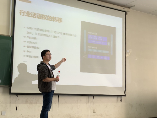 10月9日,Marteker创始人冯祺以《MarTech在中国与全球的发展》为题,开启了专题讲座的第一讲。冯祺老师以时间为主线,讲述了商品时代下的营销模式到新媒体环境下营销模式的转变,为同学们解释了MarTech的起源与发展,以及在中国的营销背景下MarTech的发展。他还为同学们分析了调研数据如何转变为企业可以应用的大数据,使同学们更加深刻地认识到数据支持对于广告营销的重要性。最后冯祺老师也强调:“技术发展是广告行业的助推器,移动通信技术的不断更新‘点燃’了广告营销行业的巨大变革。”