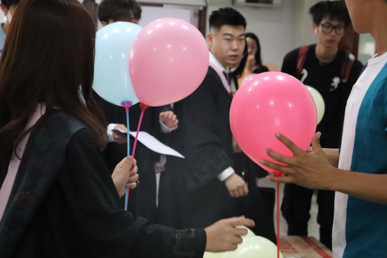 早上七点半,兼职辅导员贺琦首先在博学楼第一阶梯教室为毕业生进行就业工作指导,详细讲述了关于考研、出国等情况的档案及毕业相关流程工作。专职辅导员尹可心讲述了毕业照当天的安排。随后各班毕业生有序领取学士服及气球。