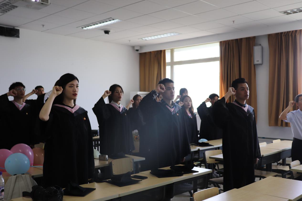 上午九点,校党委组织部副部长兼院党委副书记李凤磊在博学楼532教室为15级党员讲授“最后一节党课”,阐述了当今时代大背景下的中国局势问题,并回顾了新中国成立以来的重大变革,以此为鉴告诫毕业生要为祖国奉献,一切向前看,不忘初心、牢记使命,不负韶华,青春无悔,最后,15级党员集体宣誓。