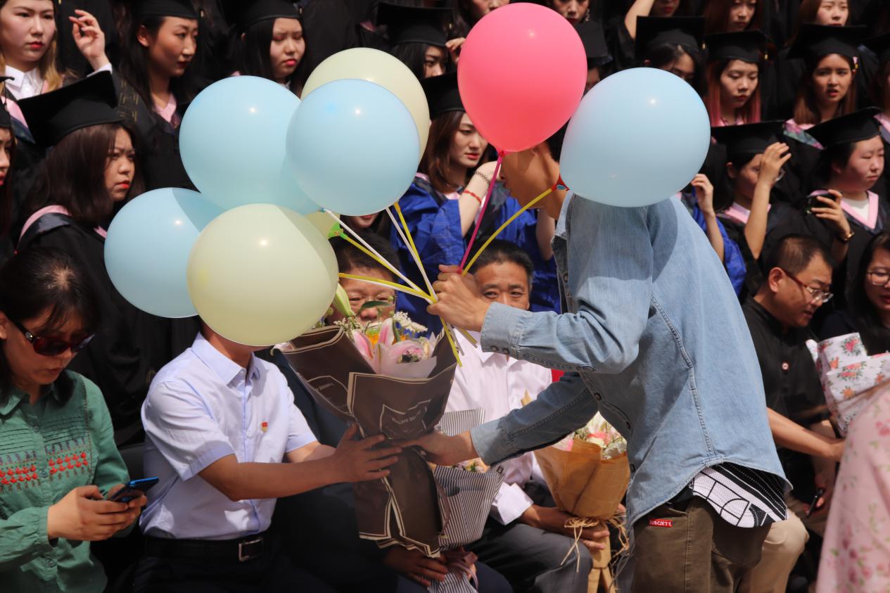 从毕业生向老师赠花致谢到有序站队拍照,从全体合照到各班合照,整个毕业照拍摄过程顺利进行。