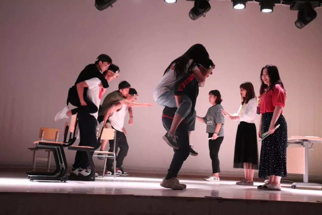 在18级各班展示结束后是一个小小的游戏环节—“你是我的眼”,规则是用黑布蒙住一个人的眼睛,被蒙住的同学背起自己的队友,被背起的同学指导被蒙住眼睛的同学通过路障。有趣的游戏环节似乎已经将现场的气氛提到了高潮。