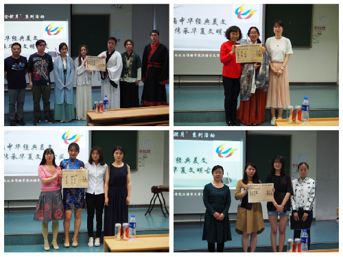 活动最后,通过统计老师评委与同学的投票,15级国际汉语教育班同学演出的《卖水》荣获本次活动一等奖,16级国际汉语教育班演出的《钗头凤》、《水调歌头》荣获二等奖, 17级广告学二班演出的《琵琶行》,17级汉语国际教育班演出的《长恨歌》、《情赋三篇》荣获三等奖,15级国际汉语教育班演出的《明月几时有》、17级传播学一班演出的《蒹葭》、17级广告学一班演出的《洛神赋》、17级传播学三班演出的《九歌·少司命》、17级传播学二班演出的《滕王阁序》荣获优秀奖。