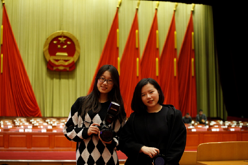 (两位实习生在人大会场合影/李健 摄)