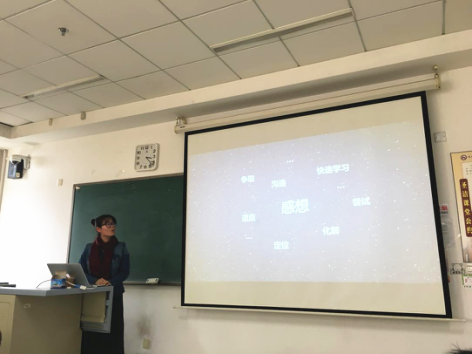 当天活动的第一项内容是由董琬亭、段雪纯、臧云頔、粟霜晴四位同学分享她们的暑期实习经历。董琬亭从实习的准备和实习过程中需要注意的事项入手,介绍了她在凤凰卫视的实习经过。同样在凤凰卫视实习的段雪纯则着重介绍了自己在实习过程中观察到的电视媒体的生产流程。臧云頔介绍了自己在湖南广电的暑期实习经过,认为积极争取、快速学习、学会沟通是实习时能否得到认可的关键。作为此次分享会上唯一拥有纸媒实习经验的同学,粟霜晴分享了自己在《人物》杂志的成果以及收获。