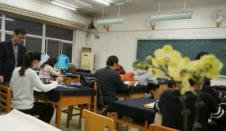 来这间教室的人很多,身份各自不同,有在校的学生,有已经毕业的校友,还有学校里爱书法的老师,更有校外慕名而来的书法爱好者。晚上六点,当一个轻盈的身影走进教室,大家都会停下手中的笔,恭恭敬敬的叫一声:宫老师!
