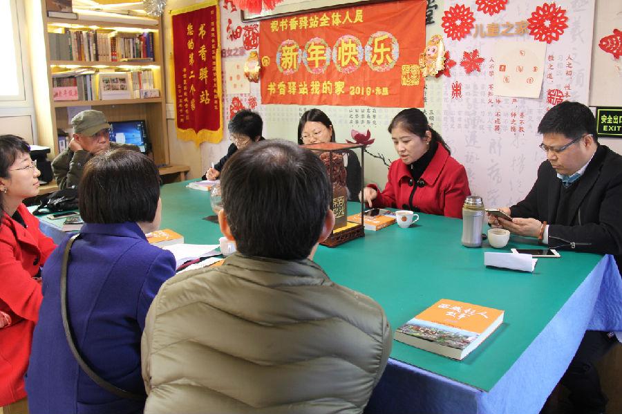 首 首先,大家观看了 “书香驿站”的宣传片,并听取了“书香驿站”发起人人 梁军关于“书香驿站”基本情况与发展目标的介绍。“书香驿站”这个由政府、企业和社会组织搭台、百姓参与的社区公共文化交流平台,诞生一年多来,通过百姓捐书百姓看、古建传播、国学课堂、健康讲座、金石篆刻、京戏讲述、日晷科普、桃园夜话、围棋象棋、老年英语、哲学传递等由志愿者和居民共同参与的活动,已经成为社区居民学习、交流、分享的平台,被居民称为“第二个家”。