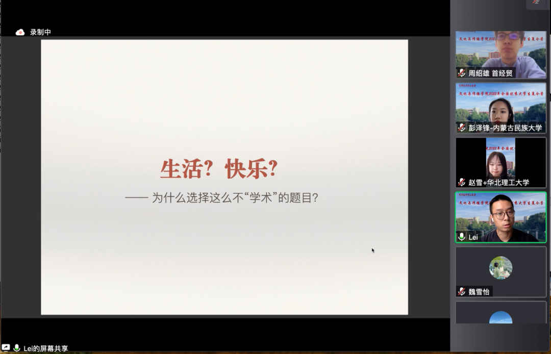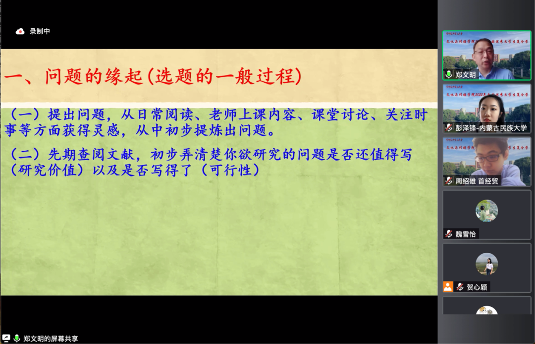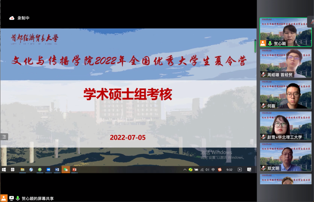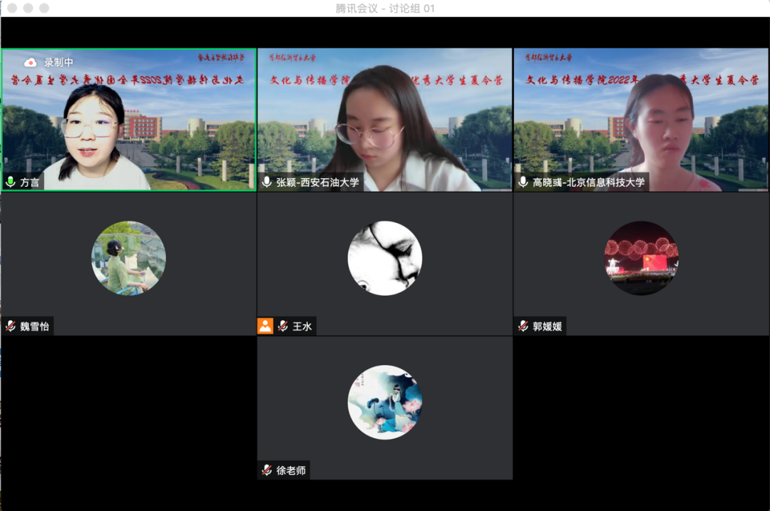 7月4号来自全国不同高校的10名大学生以腾讯会议室的方式集体报到。分管研究生工作副院长郭媛媛,学硕考核组主持人贺心颖、专硕考核组主持人许敏玉,何磊教授,以及研究生秘书郭锦鹏,在会议室欢迎营员们的到来,并安排相关事宜。当晚,营员们分别在学硕组、专硕组老师的带领下,进行了线上活动的演练。