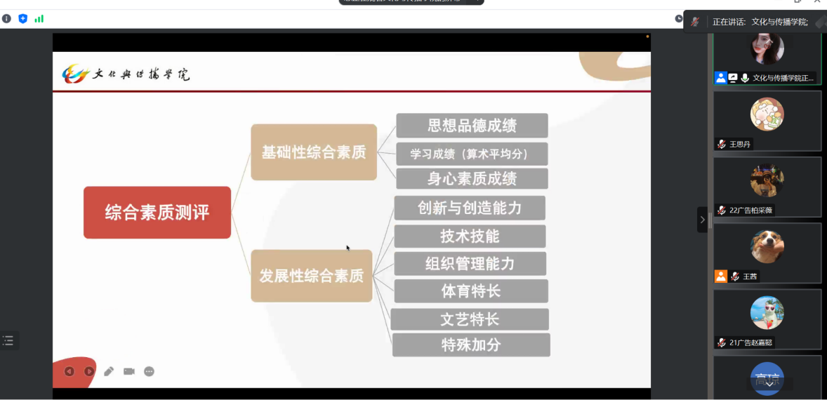 2023年6月30日,哔咔漫画 于线上召开双培生座谈会。出席本次会议的有党总支副书记高琼、副院长陆彦明、分团委书记郭奕彤、教务秘书尹思筠、专职辅导员袁心玥,以及2020级、2021级、2022级全体双培生。